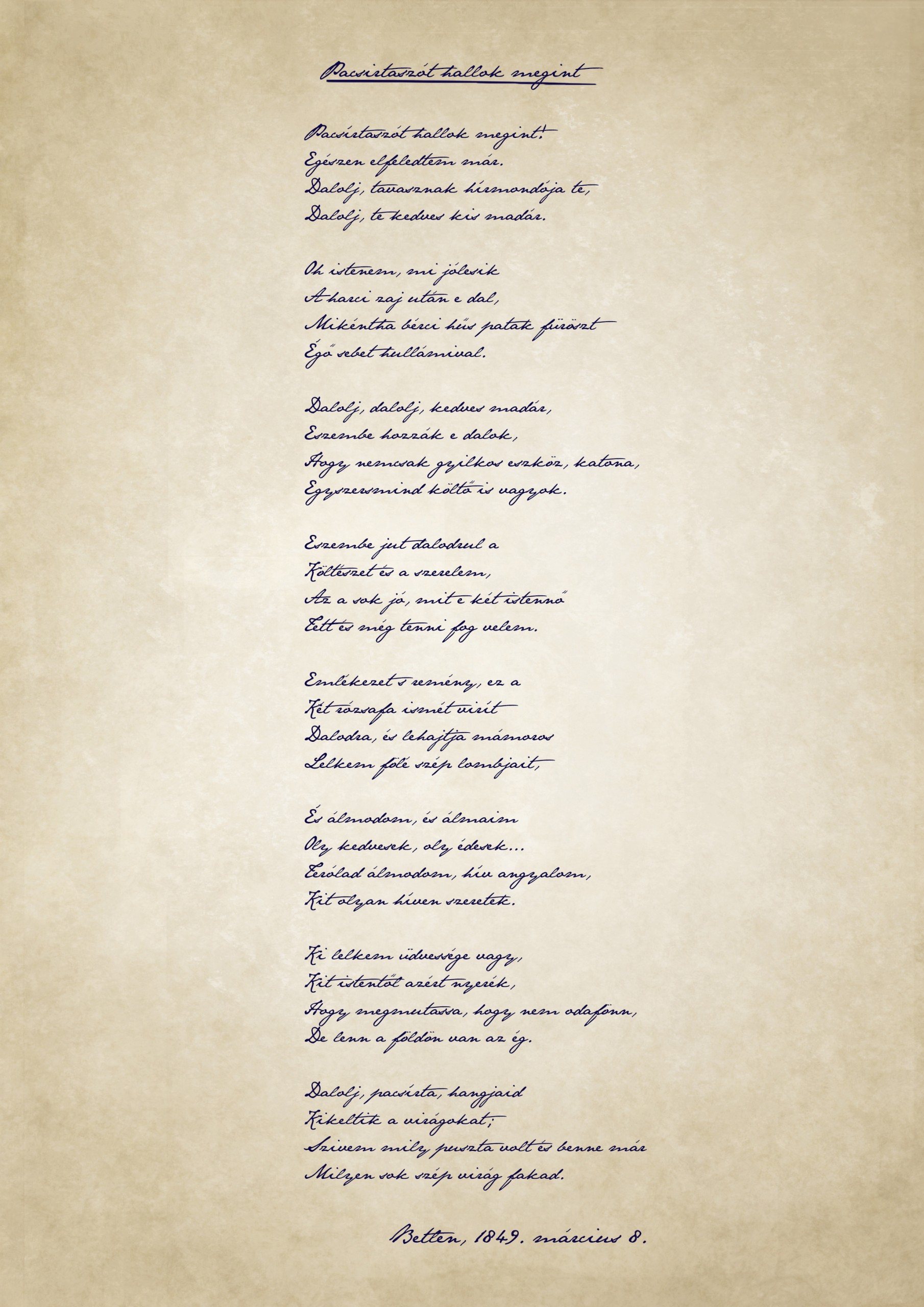 Petőfi ekkor még fia születésének örvendezett, ám hamarosan ő is beállt a magyar seregbe és részt is vett az erdélyi hadműveletekben. A váltólázban szenvedő költőt később Bem a hátországba küldte, így került Bethlenbe, ahol rácsodálkozhatott az erdélyi kikeletre, s megírta „Pacsirtaszót hallok megint” című művét.
