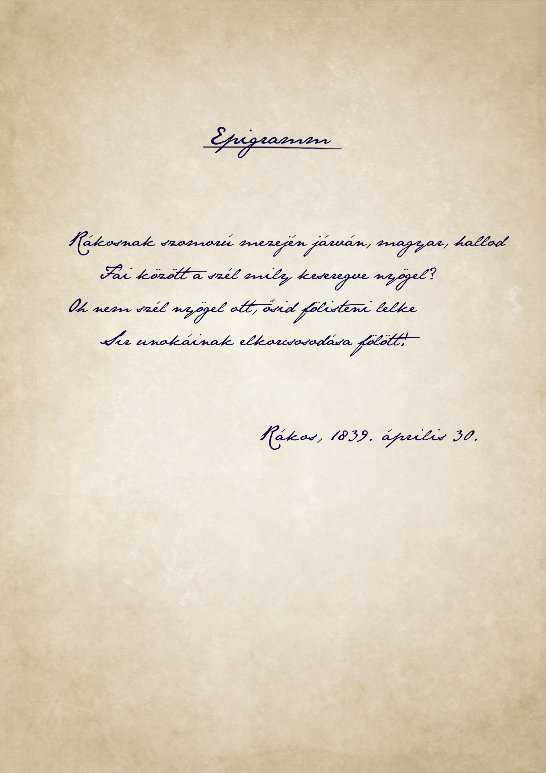 1839 hideg telén Petőfi, miután félévi vizsgái rosszul sikerültek Selmecbányán és apja megírta neki, hogy leveszi róla a kezét, szinte nincstelenül útnak indult, hogy színésznek álljon. Március elején érkezett Pest határába, napközben a környéken csatangolt, míg éjszakánként rákosmezei istállókban és csűrökben húzta meg magát. Rákosmező régi dicső napjairól szól itt született epigrammája is.