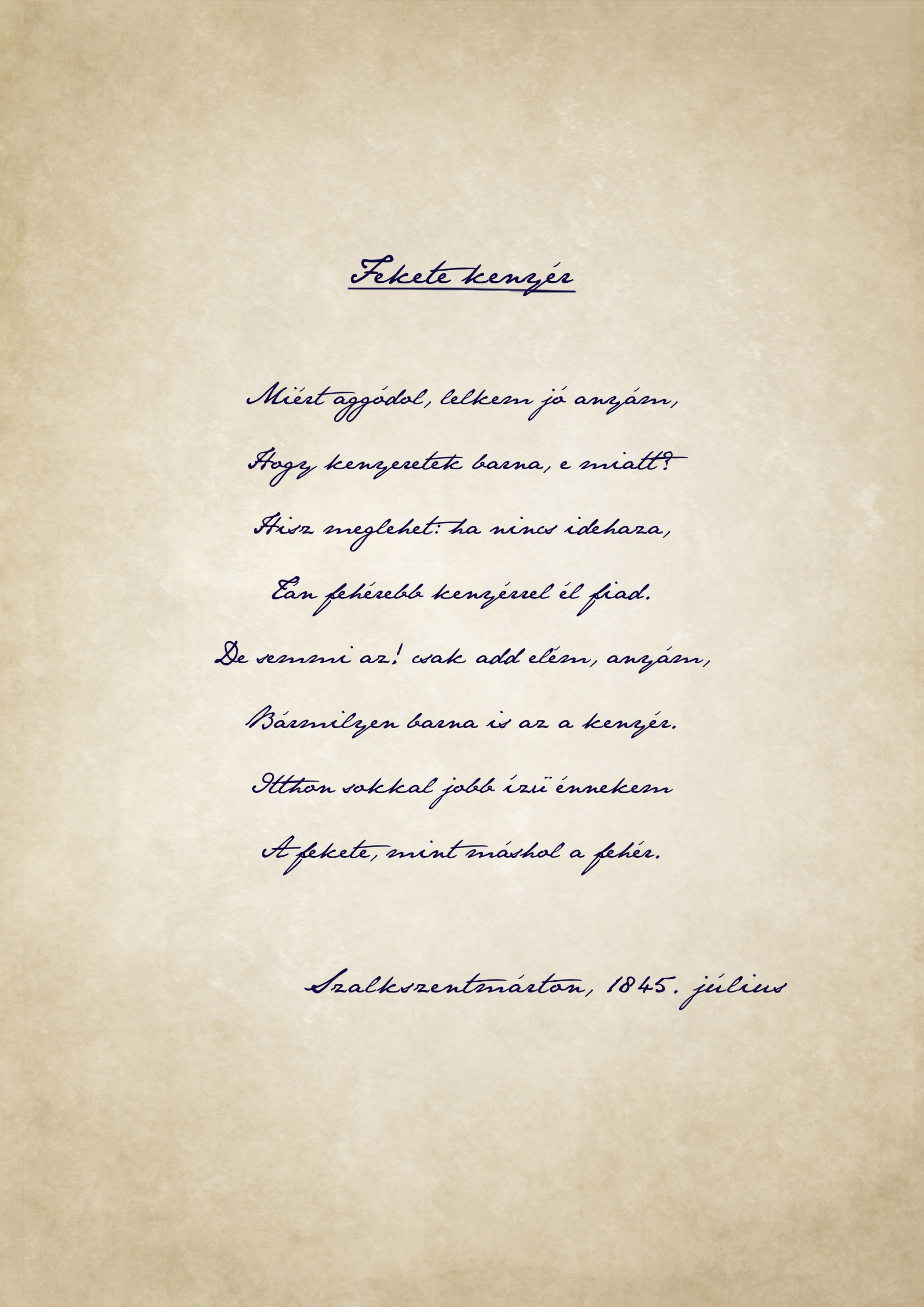 A költő 1845. júliusában érkezett meg szüleihez Szalkszentmártonba. Az egyik vendégszobát kapta meg, amelyet – hosszabb-rövidebb távollétei ellenére – otthonának tekintett. Háromnegyed év alatt 112 vers, 2 dráma és egy regény született itt tollából. Petőfi napjai szigorú napirend szerint teltek ittléte alatt: reggeltől estig az íróasztalnál ült, alkonyatkor evett, sétált vagy beszélgetett, majd éjfélig újra dolgozott. 1846. április 23-án jelent meg Pesten a Szalkszentmártonban született „Felhők” című kötete. Ugyanezen a napon, a Petrovics család ingóságait árverezték a helyi kocsma udvarán, ugyanis Petrovics István nem tudta fizetni a mészárszék bérleti díját. Másnap a költő Dömsödre költöztette szüleit, de Szalkszentmártonnak maradt a dicsőség, hogy Pest után itt született a legtöbb Petőfi-költemény, melyek közül az első, a „Fekete kenyér” című, mindjárt egy remekmű.